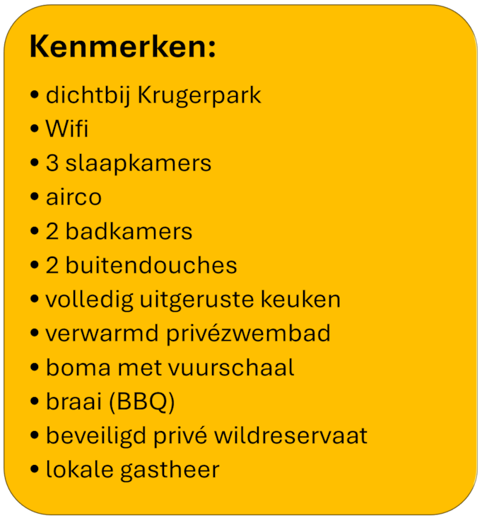 Het charmante stadje Hoedspruit ligt op slechts enkele minuten afstand en biedt een scala aan restaurants en winkelmogelijkheden. Daarnaast ben je slechts 40 minuten verwijderd van het wereldberoemde Kruger National Park en 45 minuten van de adembenemende Blyde River Canyon. Tal van andere toeristische activiteiten bevinden zich dichtbij.